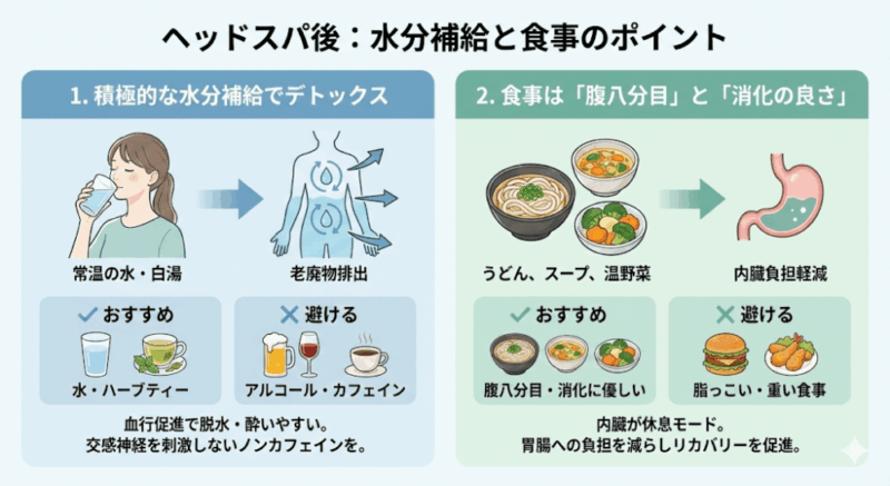 ヘッドスパの後は、体内の老廃物が流れ出しやすい「デトックスモード」になっています。このタイミングで何を摂取するかによって、体内の循環効率が大きく変わります。