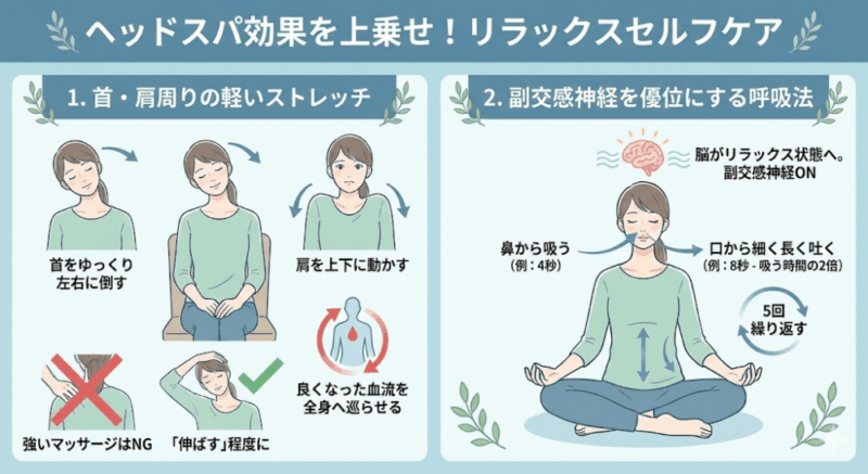 鼻からゆっくり吸って、口から細く長く吐き出す「腹式呼吸」を5回ほど繰り返すだけで、脳がさらにリラックス状態へと導かれます。特に、吐く時間を吸う時間の2倍にすることを意識すると、副交感神経が優位になり、ヘッドスパの相乗効果が得られます。