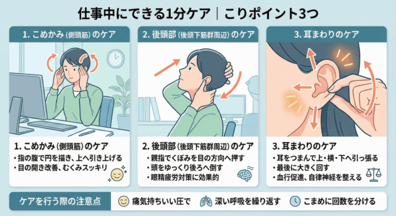 仕事の合間に「少し目が疲れたな」と感じたとき、その場で座ったままできるセルフケアを取り入れましょう。たった1分で頭皮のこりをほぐし、視界をクリアにするポイントを3つご紹介します。