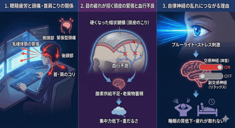 「目が疲れているだけだから」と軽く考えがちですが、眼精疲労は全身の健康状態に密接に関わっています。特にデスクワークが続く環境では、目の周りの筋肉だけでなく、頭皮や首周りまで深刻なダメージを受けていることが多いのです。