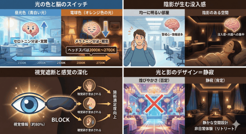 ヘッドスパでは当然、色温度の低い(2000K〜2700K程度)暖色の光が使われます。これにより、脳に「夜が来た、休んでいい」という指示を出すのです。