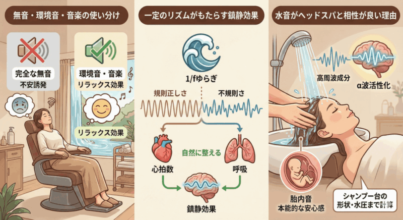 ヘッドスパにおいて、聴覚情報の設計は非常に繊細です。完全な無音は逆に耳鳴りや不安を誘発することがあるため、多くの名店では「環境音」に近い音楽を導入しています。