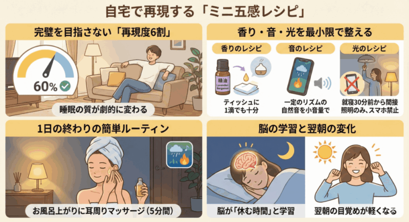 プロの五感設計は、実は自宅のセルフケアにも応用可能です。完璧を目指す必要はありません。__「再現度6割」__を目指すだけで、睡眠の質は劇的に変わります。
