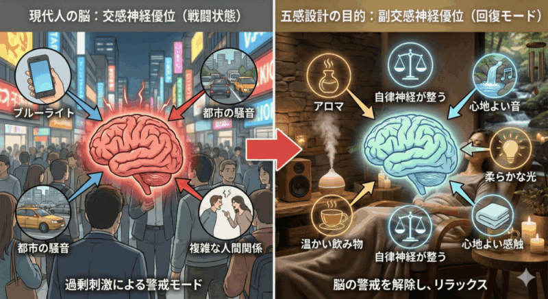 五感(視覚・聴覚・嗅覚・味覚・触覚)を特定の周波数や波長で満たすことで、脳は「情報の整理」を止め、「感覚の受容」に専念し始めます。これが、思考が止まり、深い瞑想状態に近い「まどろみ」へと誘われるメカニズムです。