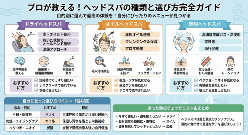 そう思って予約サイトを開いたものの、ドライヘッドスパ、オイルヘッドスパ、炭酸ヘッドスパ……とメニューが多すぎて、どれを選べばいいか迷ってしまった経験はありませんか?