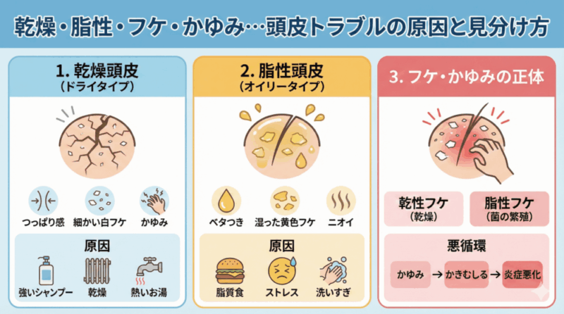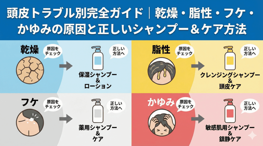 頭皮トラブル別完全ガイド|乾燥・脂性・フケ・かゆみの原因と正しいシャンプー&ケア方法
